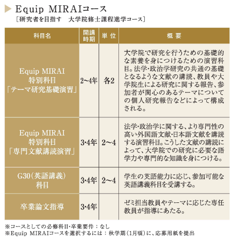 Equip MIRAIコースの学生には、学生用研究室の利用など、勉強をサポートする環境も提供されます。このコースの学生には、大学院(法学研究科総合法政専攻)の受験・進学も期待されています(受験は必須ではありません)。
