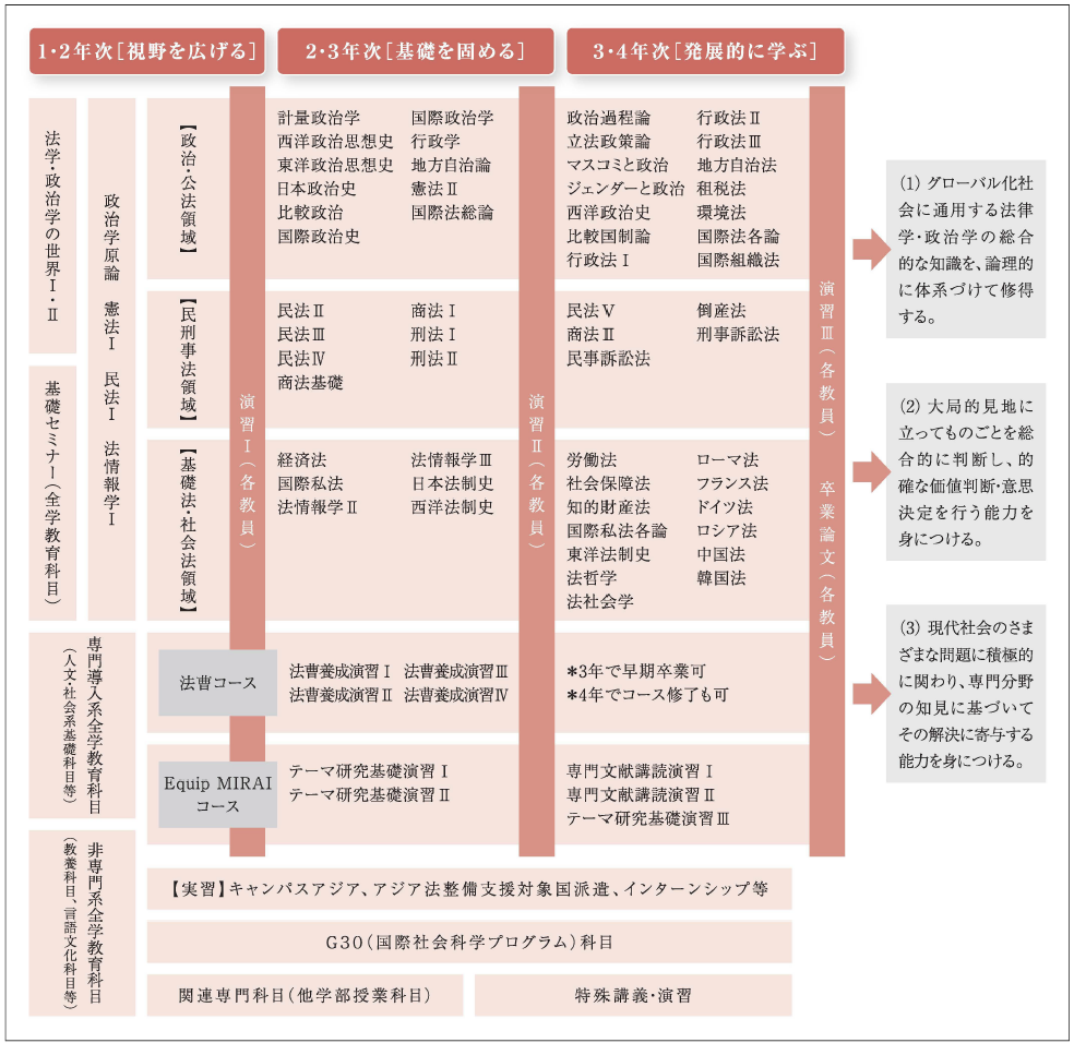 | (1) グローバル化社会に通用する法律学・政治学の総合的な知識を、論理的に体系づけて修得する。 |