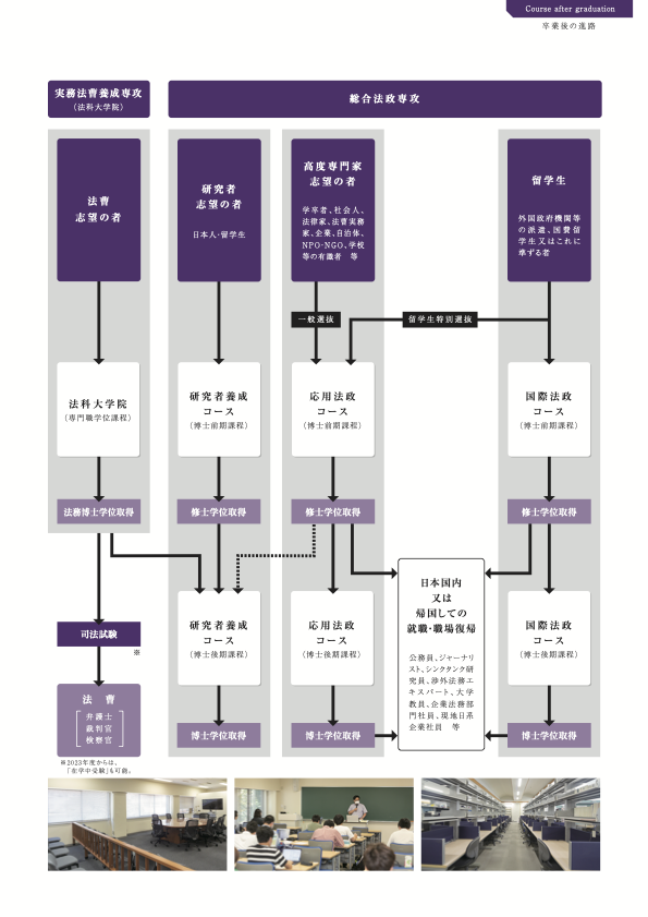 総合法政専攻・国際法政コースにおいては、高度の研究に加えて、共同研究、研究組織、教材作成、論文執筆などの幅広い技能習得を目的とし、留学生が高度な専門知識と幅広い視野を得ることを目的にしています。